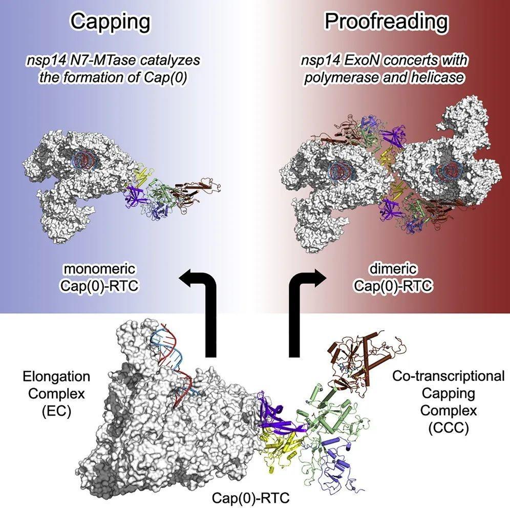 新冠病毒转录复制复合体的mRNA加帽状态与复制校正状态图
