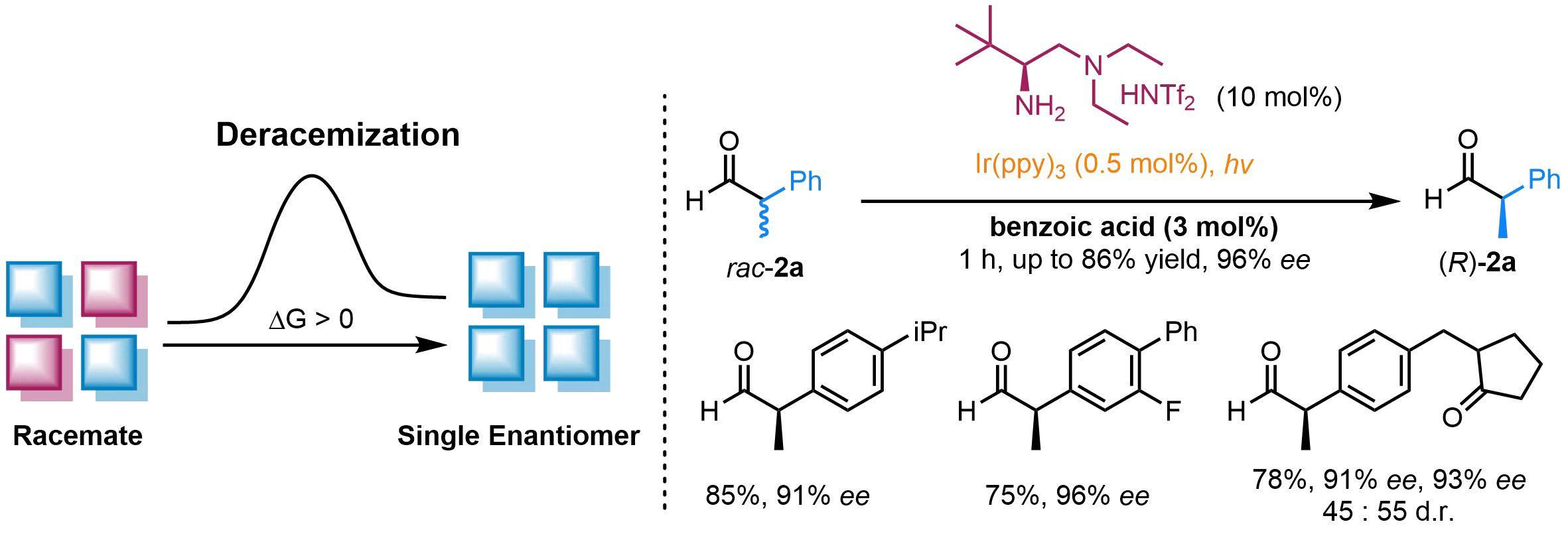 2011年,罗三中课题组利用所发展的仿生伯胺催化体系,发展了首例不对称烯胺质子化反应,实现了对最小的原子—质子的立体选择性迁移调控,该体系演化的终极目标即是简单醛酮的去消旋化。经不断探索,该课题组将仿生伯胺催化与可见光催化创造性联动,成功实现了α-芳基醛的高选择性去消旋化反应(图1右)。该反应体系简单,条件温和,能够在一小时内达到光平衡,实现高效去消旋化。在底物骨架上修饰吸电子基、给电子基、烷基、极性官能团、天然产物片段、杂环等均可以获得优秀的反应效果,展现出良好的底物适用性;反应能够被放大到克量级,成功应用于合成一系列非甾体手性抗炎药物。