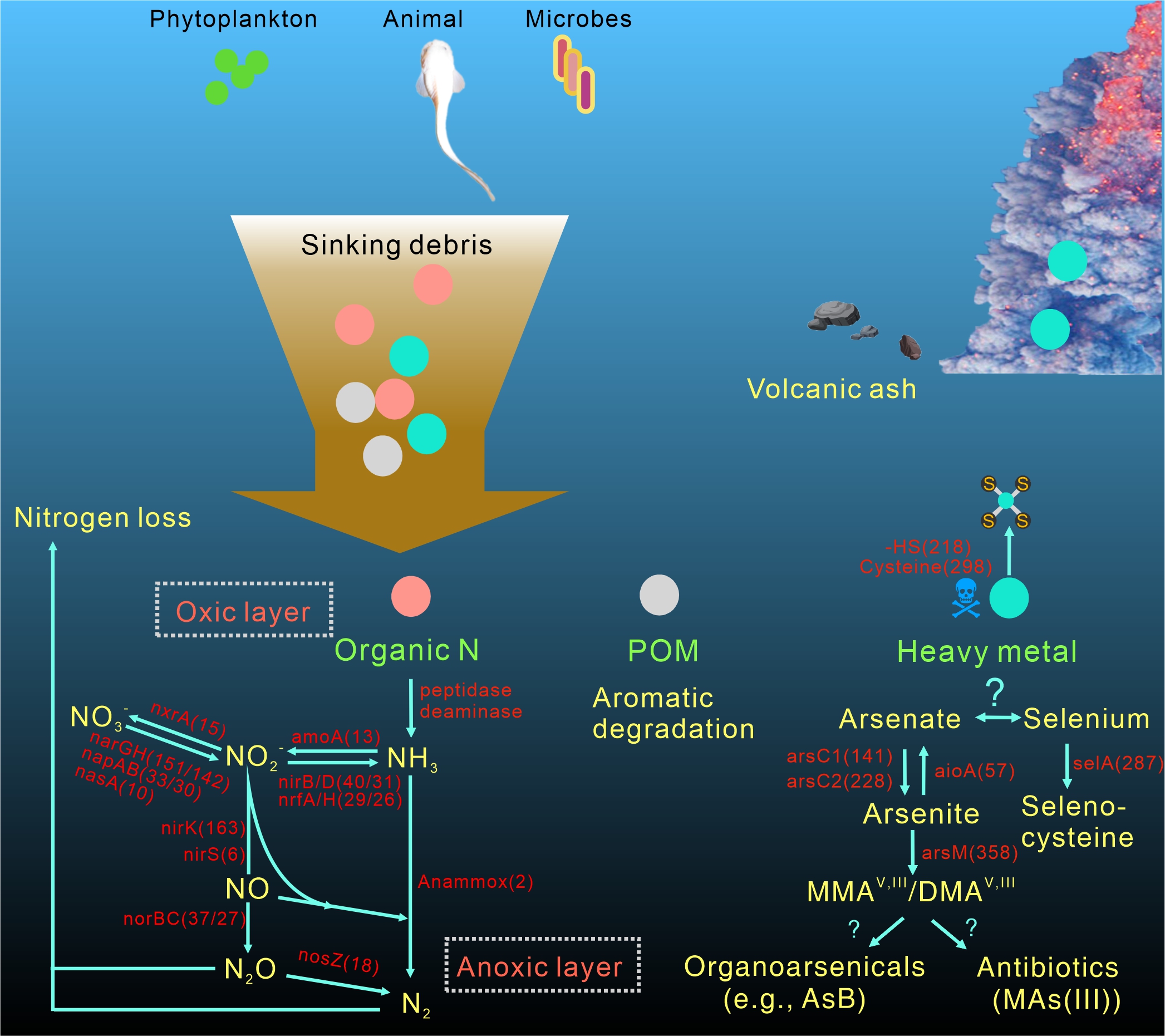 研究团队借助中科院在深海万米科考装备和技术上的突破,获得了挑战者深渊南北坡和底部共13个站位的沉积物柱状样,分析了37个宏基因组,揭示了挑战者深渊沉积物中原核微生物新种比例达到26%,高于目前所有已研究的深海环境,并且微生物新颖性随水深和沉积物深度增加而增加(图1)。基于586个微生物基因组的功能分析显示这些微生物广泛存在芳香类有机物降解和氨基酸利用(81%)的相关基因,优势微生物可以进行氨氧化途径和固碳合成新鲜有机质,将深渊累积的有机氮转化成氮气,释放到上层水体,可能有助于全球氮元素的平衡(图2)。本研究还发现了深渊沉积物中砷和汞的累积,并且61%的深渊微生物基因组中含有三价砷甲基化基因,起到重金属解毒的作用同时将甲基砷作为耐压剂抵御深渊的高压。