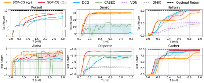 该研究首先构造了特殊的协作图类,这些协作图上的联合动作决策可以在多项式时间内精确求解。之后,该研究在时序差分学习的框架下设计了动态协作图的机制,算法可以根据多智能体系统状态的不同从协作图类中选择最优的协作图,这弥补了单一协作图表达能力可能不足的问题。在多个复杂的多智能体合作任务上的实验结果表明,该算法能在动态环境中自适应地选择合适的协作图结构,并取得了协作图算法中最领先的性能。