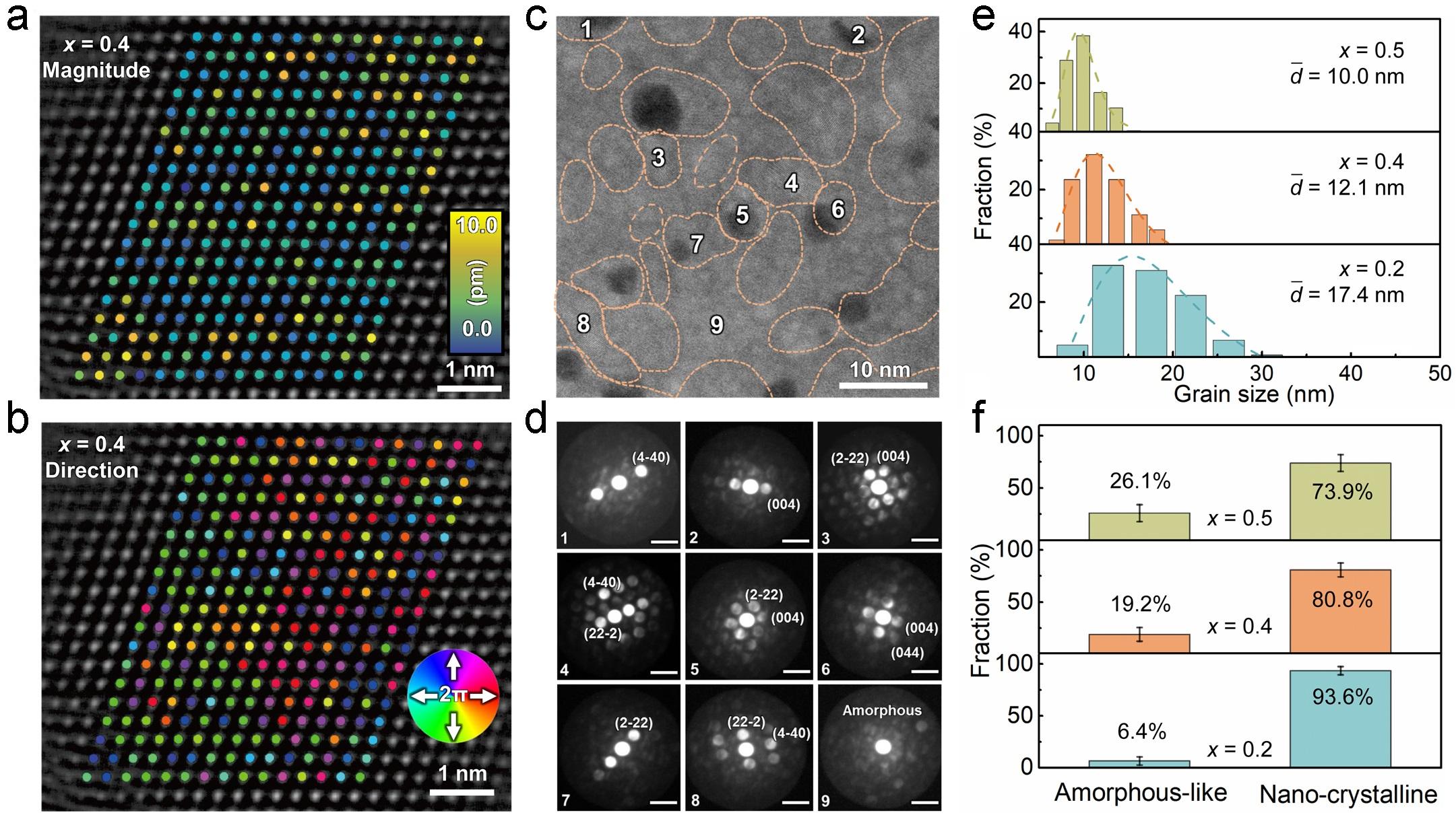 通过高熵的调控(多元素在等效晶格位上无序共存,如图1d所示),降低了稳定的烧绿石相的漏导与损耗、同时提升了其击穿场强,使其在高电场下可以有效降低滞回损耗,从而提升了储能效率(图2)。利用先进电子显微学方法对此高熵材料的显微结构与性能改善的关联性进行了研究,发现此材料由纳米晶和少量均匀分布非晶构成。随着熵的增加,纳米晶的晶粒尺寸逐渐减小,非晶相比例逐渐提升(图3)。小的纳米晶粒尺寸和非晶相的增加有利于材料绝缘性能的提升,且这类纳米晶和少量均匀分布非晶也使此材料可以保持较高的极化。最终,团队在x=0.4的高熵薄膜(~0.6 微米厚)中,实现了最优的182 J cm-3的储能密度和78%的效率,并具有极好的循环和温度稳定性(图4)。这种高熵的设计思路有望被广泛的用于提升介电材料储能特性。
