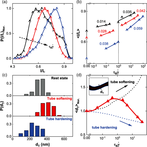 实验量化研究了聚合物链的管道直径,并将剪切作用下的管道直径与静止状态下进行比较,如图2所示。结果发现,随着剪切速率的增加,管径比值增加,达到最大值后缓慢下降。这说明当聚合物链的定向排列占主导地位时,更容易垂直于其主轴方向波动,管径增大,管道先发生“软化”;当聚合物链的拉伸占主导地位时,刚度增加,管径减小,管道“硬化”。两种机制之间相互竞争,使得聚合物链的管径在变化过程中出现峰值。