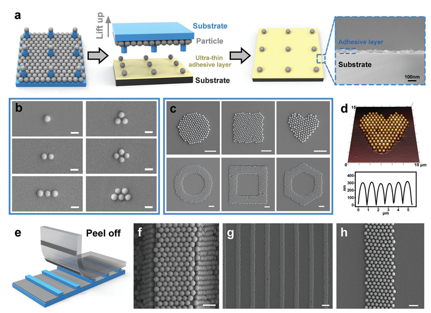 受启发于传统油墨印刷,课题组进一步提出了基于纳米颗粒自组装转移印刷的胶体晶体微图案制备方法,实验揭示了纳米颗粒黏、脱附转移机理,实现了单纳米颗粒精度的微图案制备,同时继承保留了油墨印刷批量化快速制造的优势。进一步结合导电胶体材料,证明了它在柔性微电子大尺寸制造等领域中的应用潜力。这种高效的纳米颗粒大面积自组装-微图案化制造策略为光子晶体、微结构/图案制造、柔性微电子等众多领域提供了新思路,为学术和实际工业应用提供了广阔的机会。