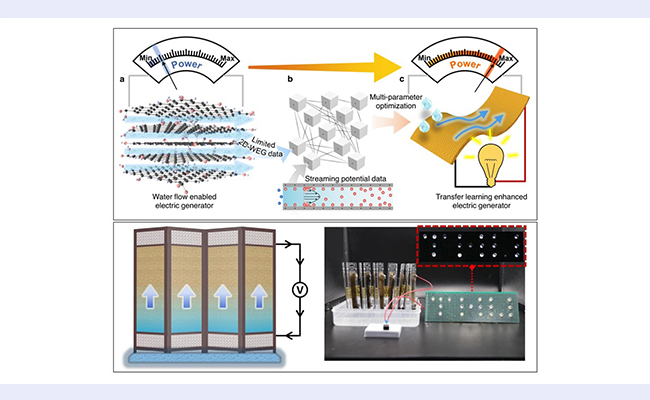 清华新闻网11月15日电 地球上的海洋、江河、空气中含有巨大且丰富的水资源。近年来,利用水资源与纳米材料相互作用产生电能的研究受到广泛关注,所构建的水诱导发电机(Water-enabled Electricity Generation, WEG)或者水伏器件是一种新型的清洁能源材料技术,有望助力人类社会未来可持续发展。然而,水与纳米材料相互作用产生电能过程受到纳米级通道结构、规模集成度、多重材料参数等的耦合影响,使得开发高性能的水诱导发电机非常困难。