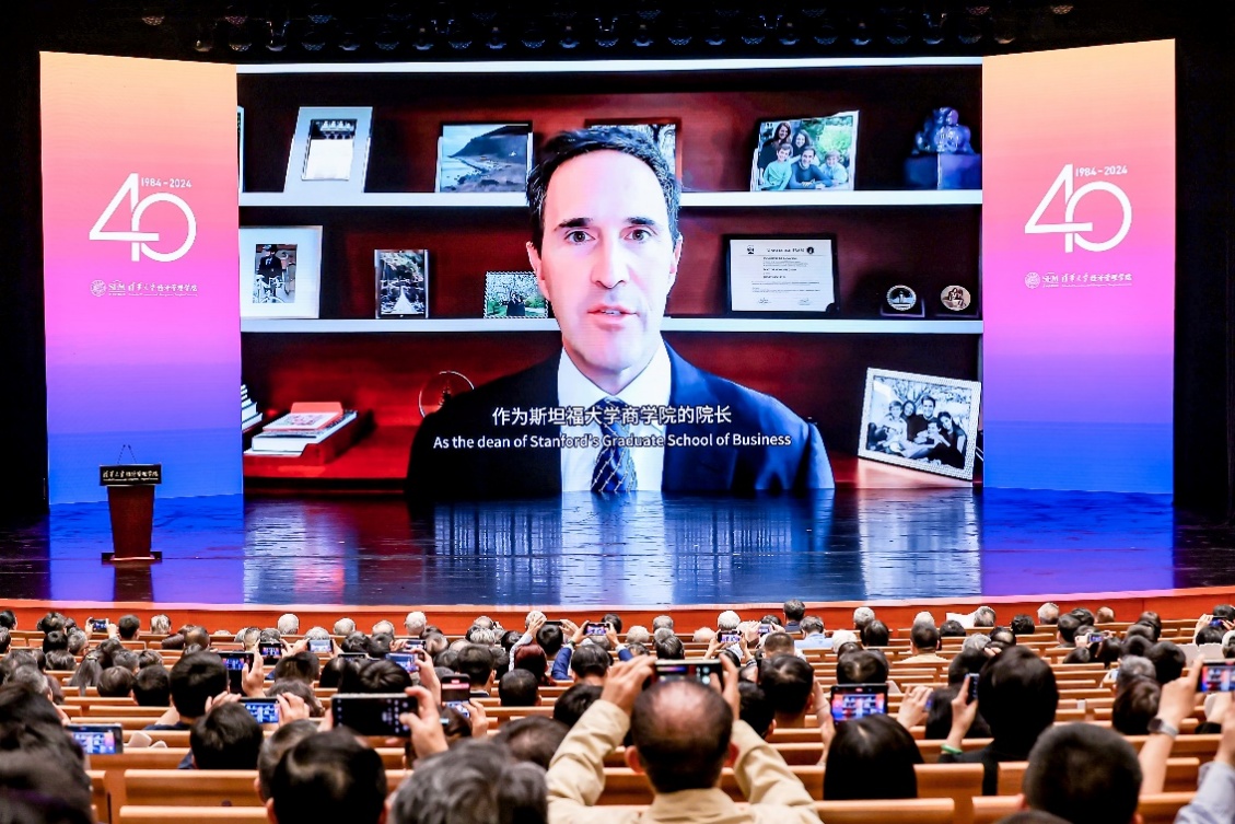 经管学院顾问委员会主席库克在视频致辞中表示,清华经管学院不仅是一所教育研究的中心,更是一座连接中国与世界的关键桥梁。在担任学院顾问委员会主席的四年间,见证了学院在提供卓越教育、推进重要研究和汇聚全球人才方面的努力与成绩,为自己能够成为其中一员而倍感自豪。斯坦福大学商学院院长、清华经管学院顾问委员会委员乔纳森·莱文在视频致辞中表示,很荣幸能够见证经管学院在师资队伍、人才培养、产学研合作、跨学科交叉等方面的逐步发展,祝福经管学院在下一个四十年仍然可以激荡思想,培育未来领袖。