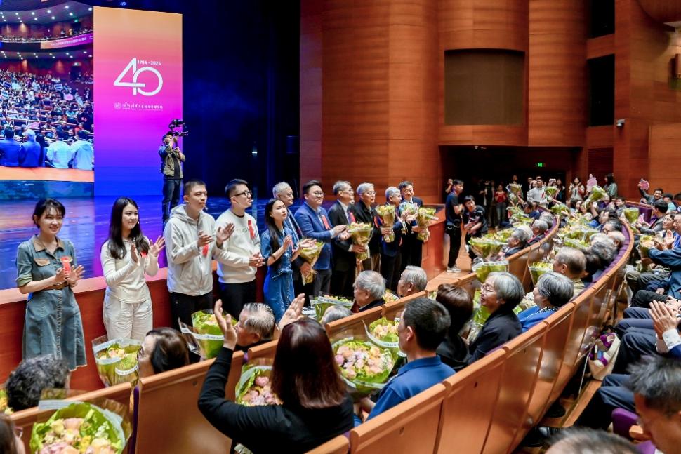 伴着温暖的旋律和欢快的节拍,“桃李芬芳,感念师恩”环节开启。学生和校友代表为50位现场出席活动的离退休教师献上鲜花,感恩他们长期以来为学院发展建设作出的重要贡献,祝福他们健康长寿、福乐绵绵。