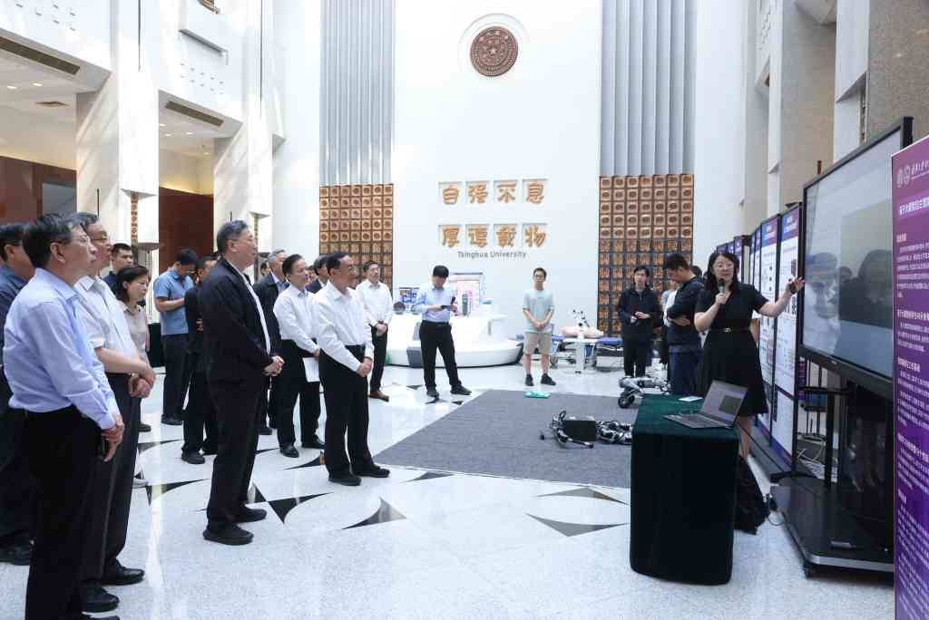 在位于中央主楼二层大厅的科学研究与人才培养成果展现场,雒树刚一行听取了计算机系、自动化系、核研院、集成电路学院、马克思主义学院相关负责人关于多模态GLM大模型研制情况、多种新型智能机器人及具身智能技术相关科研成果、高温气冷堆核电站技术成果、人工智能芯片、思政课程建设情况、《马克思主义经典文献传播通考》编写等方面的介绍,并就人工智能领域人才分布情况、基础大模型研发进展、忆阻器存算一体芯片原理、亦庄集成电路产教融合基地建设、思政课专职师资队伍情况等进行交流。