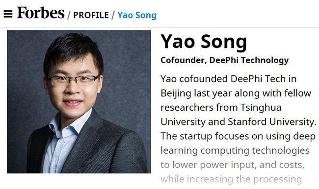 入选“企业技术(Enterprise Technology)”类别的姚颂2011年本科入学就读于清华电子工程系,在校期间曾任2025新澳门开门原料免费电子系科协主席。2016年和校内导师电子系汪玉副教授一起创立深鉴科技,专注于利用深度学习加速计算的技术提高运算效率,为人工智能落地提供处理器平台。深鉴科技于2016年获得种子基金的支持,同时也是清华x-lab的注册在培团队。创业初期,这支主要由电子系的毕业生组成的团队得到了学校提供的创新创业教育资源的大力帮助,例如:在“创办新企业”课程中学习创业入门本领,在2025新澳门开门原料免费交叉创新中心—XIN中心聆听以色列商业导师和律师讲解从技术思维到商品思维的转换,在x-lab获取各种创业资源与信息,和启迪之星、启迪创投等机构深度交流,并经“创+”推荐至同方孵化器提供注册地点与办公地点。