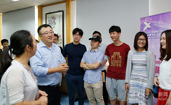 杨斌与全球创新学院报到新生交谈。记者 张 宇 摄