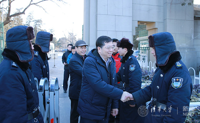 在西校门,邱勇与值勤的保安员一一握手,详细询问节日期间值班安排及工作落实情况。在校医院,邱勇向医生和护士致以新春的问候,对他们的辛勤工作表示衷心感谢。在网络中心监控中心(FIT楼),邱勇听取了网络运行保障的汇报,并通过视频问候了在其他监控分中心值班的老师。在变电站和供暖锅炉房,邱勇检查了设备设施的运行情况,要求值班人员要加强安全生产管理,切实做好基础设施的运行保障工作。在紫荆学生公寓总服务台、城管高校分队和街道城管科、派出所、校园安全监控中心,邱勇要求大家要加强巡逻和值班,确保辖区安全有序。在清芬园食堂、甲所餐厅、照澜院超市等处,邱勇与工作人员亲切交谈,希望他们坚守岗位,做好节日期间服务保障工作。副校长吉俊民以及学校有关部门负责人陪同看望慰问。
