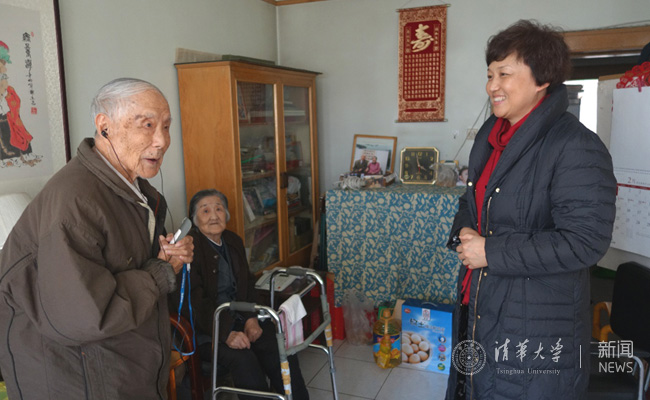 邱勇校长看望修缮中心退休职工、百岁老人田江。记者 苑 洁 摄