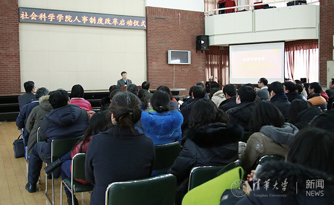 姜胜耀代表学校对社科学院人事制度改革的正式启动表示感谢和祝贺,认为通过人事制度改革,社科学院对其学科发展定位重新进行了梳理和认真总结,明确了目标,并达到了共识,这是今后学院发展更宝贵的财富。同时他从国际、国内的竞争形势与国家需求等方面强调了人事制度改革的重要性与必要性,指出人事制度改革是使命驱动,是保持国内领先、在国际上更进一步的需要,与国家“双一流”计划的要求相符合。希望社科学院能够维护和执行好新的人事制度,并以此为契机,逐渐形成人事管理的文化,开启一个新的模式,在世界一流、中国特色、清华风格的办学实践中作出应有的贡献。