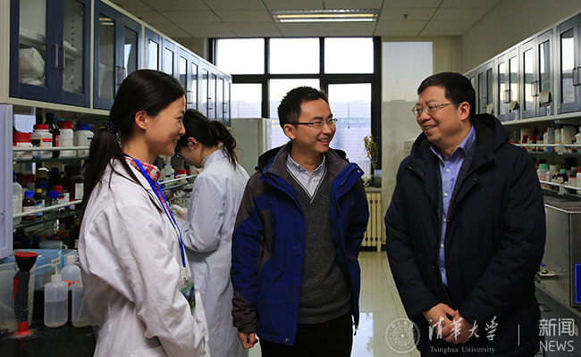 邱勇首先来到青年教师实验室。他先后调研了入选2015年度全球杰出青年创新人物(TR35)的戈钧副教授以及张强副教授实验室,听取了相关研究介绍,并与正在开展实验研究的学生进行了交流。