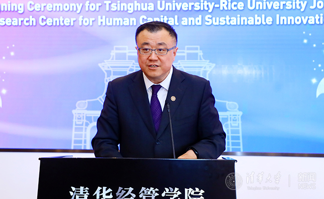 经济管理学院院长、联合研究中心管委会主任白重恩在致辞中表示,联合研究中心的使命是汇集知识,汇聚人才,以持续不断的创新思想服务人类。莱斯商学院(Jones Graduate School of Business)和清华经管学院都是各自国家顶尖的经济管理类学术机构,双方优势互补、强强联手,一定会持续不断地为人类社会贡献创新思维。