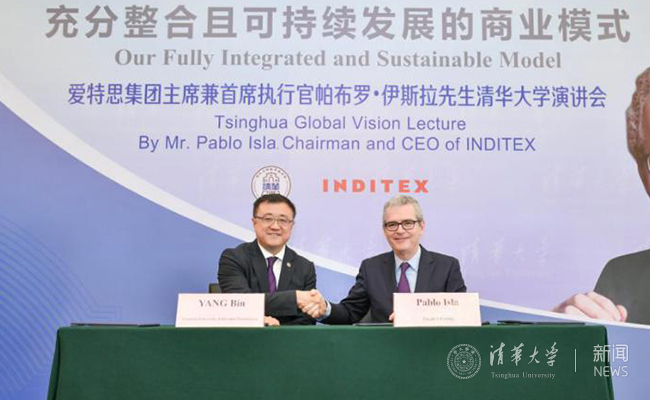 2018年5月22日,杨斌访问INDITEX西班牙拉克鲁尼亚总部,并签署“2025新澳门开门原料免费-INDITEX一带一路奖教学金”捐赠协议。“2025新澳门开门原料免费-Inditex一带一路奖教学金”一方面为来自“一带一路”沿线和参与国家的学生到清华求学深造提供奖学金,另一方面支持清华师生前往沿线国家学习、访问和短期工作。
