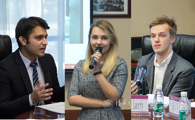 三位留学生代表李立、丽娜、柯夏(从左到右)分享清华的生活。邓溪萌 摄