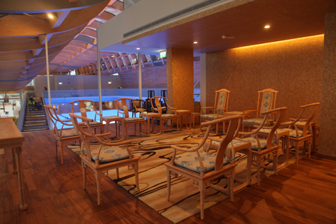 结合主题,在选材方面坚持可持续发展的环保理念,打造亲近自然的室内空间。主要四个空间为:一层开放用餐区、二层宴会厅、影音厅及贵宾室。一层开放用餐区的墙面选用了简单自然的OBS欧松板饰面,顶面为金属冲孔板,地面使用了抛光混凝土加树脂漆的淳朴材料,结合一望无际的“麦田”景观,凸显贴近自然的原生态设计理念。二层以“盛夏”为主题的宴会厅色彩热情浓郁,活动屏风的编制取自于民间的竹编图形,有贵宾入席时可将屏风围合展开,让每位宾客都能有中国用餐礼仪中讲究的“靠墙之位”,八方皆为上座,弘扬中华餐饮礼仪。影音厅以体现中国古代劳动人民智慧与勤劳的“梯田”为主题,在坡地上分段沿等高线建造的阶梯式“农田”与影音厅地面的座位有机的结合在了一起,取用我国特有的24节气中“春分.谷雨”为主题的地毯将地面装点得翠绿清爽,与叠起的“梯田”座椅相结合,让观众仿佛置身自然之中。巨大的无缝拼接led飞屏给观众带来最震撼的视觉享受。贵宾室的设计将土地与树的元素融入其中,配有“金秋”主题的地毯与“生生不息”主题的挂毯。在配饰方面融入了24节气元素进行色彩及意向图样的艺术创作,使中国独有的节气文化与室内展陈进行了艺术化的融合。