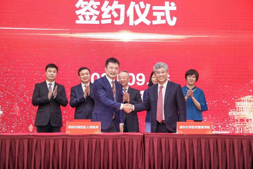 签约仪式由清华经管学院党委书记兼副院长陈煜波主持。黄伟、白重恩分别代表深圳市福田区、清华经管学院签署合作协议。