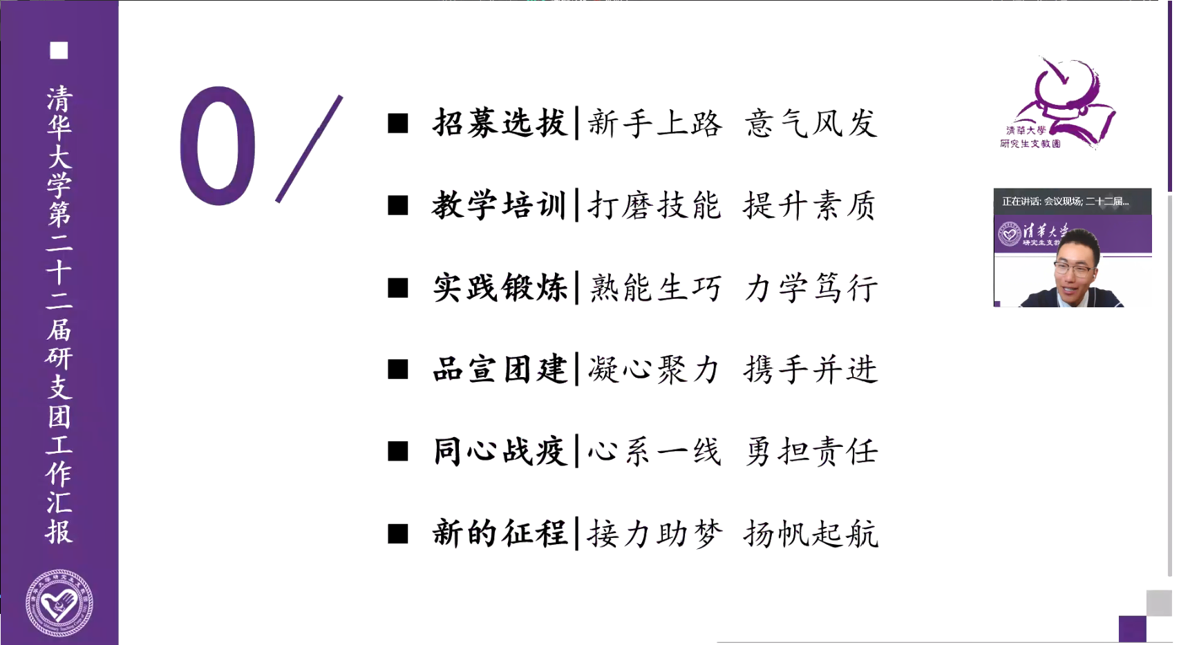 第二十二届支教团团长耿威在西藏八一校线上参会,代表全团汇报二十二届支教团培训情况及近期工作。在一年培训期中,全团累计组织26次例会培训,内容涉及思想政治、教学能力、综合素质等方面。此外,第二十二届支教团还组织赴长沙县实验中学、阳泉市第一中学的大型支教实践,并参与若干次小型周末实践,努力在实践中提高自身教育教学能力。疫情期间,第二十二届支教团配合iTsinghua云学堂开展18次线上课程分享。今年8月,志愿者陆续到岗,各项工作平稳有序开展。