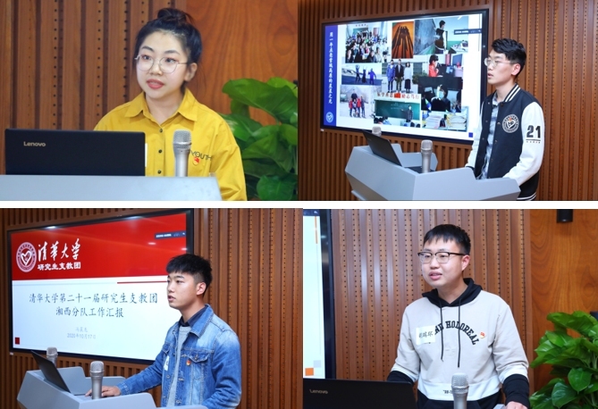 第二十一届支教团青海分队队长朱明媛、西藏分队队长王晓宇、湘西分队队长冯晨龙、陕西分队队长韩储银和云南分队队长胡瑞环分别汇报了各分队在支教地的工作情况及所获成果。