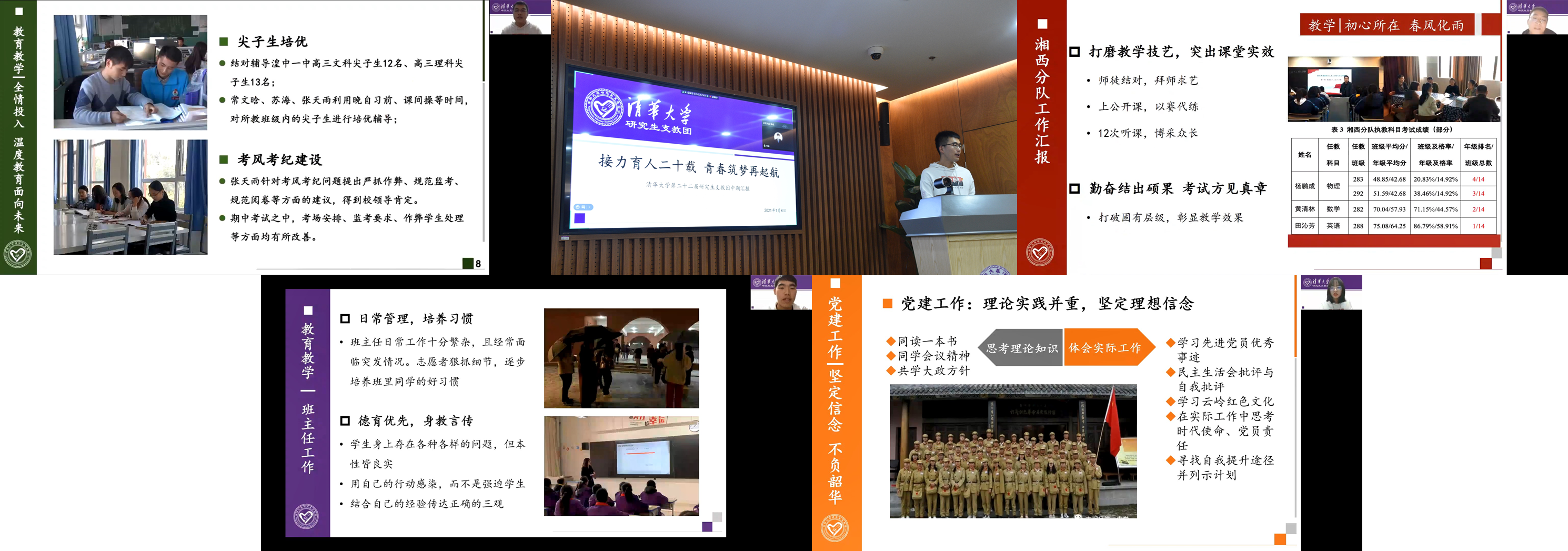 汇报会上,第22届研究生支教团团长、2016级计算机科学与技术系本科毕业生耿威代表全团汇报了支教团工作开展半年来的整体情况。在教育教学方面,第22届支教团目前服务位于青海、西藏、湖南、陕西、云南五地的六所学校,志愿者人均周课时量为19节,所带班级及所教科目大部分在年级里名列前茅。在党建工作方面,志愿者依托支教团功能型党支部和所在学校党支部,开展了一系列理论学习和参访实践活动,了解国情民情,助力乡村振兴。在团学工作方面,志愿者们参与到各支教地学校的第二课堂、学生会、社团、文体活动及特长生培养等工作中,重视课内外联动,提高学生综合素质。在公益实践方面,第22届支教团结合不同地区的实际情况,进一步完善“助梦计划”公益体系,突出项目创新性,重点关注独生子女和留守学生的心理问题。
