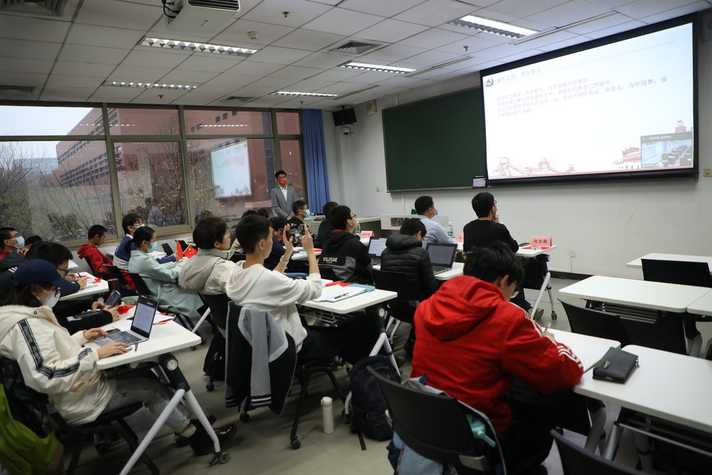 在航15班团支部与武警兵团总队执勤第五支队交流分会场,航院学生工作组组长王海东围绕“清华与强军”主题介绍了清华与航院在助力强军事业中的具体行动与贡献,武警兵团总队官兵作了主题为“畅谈十年来国防和军队事业发生的深刻变革”的报告。随后,航15班团支部三位同学分别进行主题分享和汇报。最后,部队官兵和与会师生一同围绕“军人事业的危险性和军人的责任与担当”话题展开讨论。