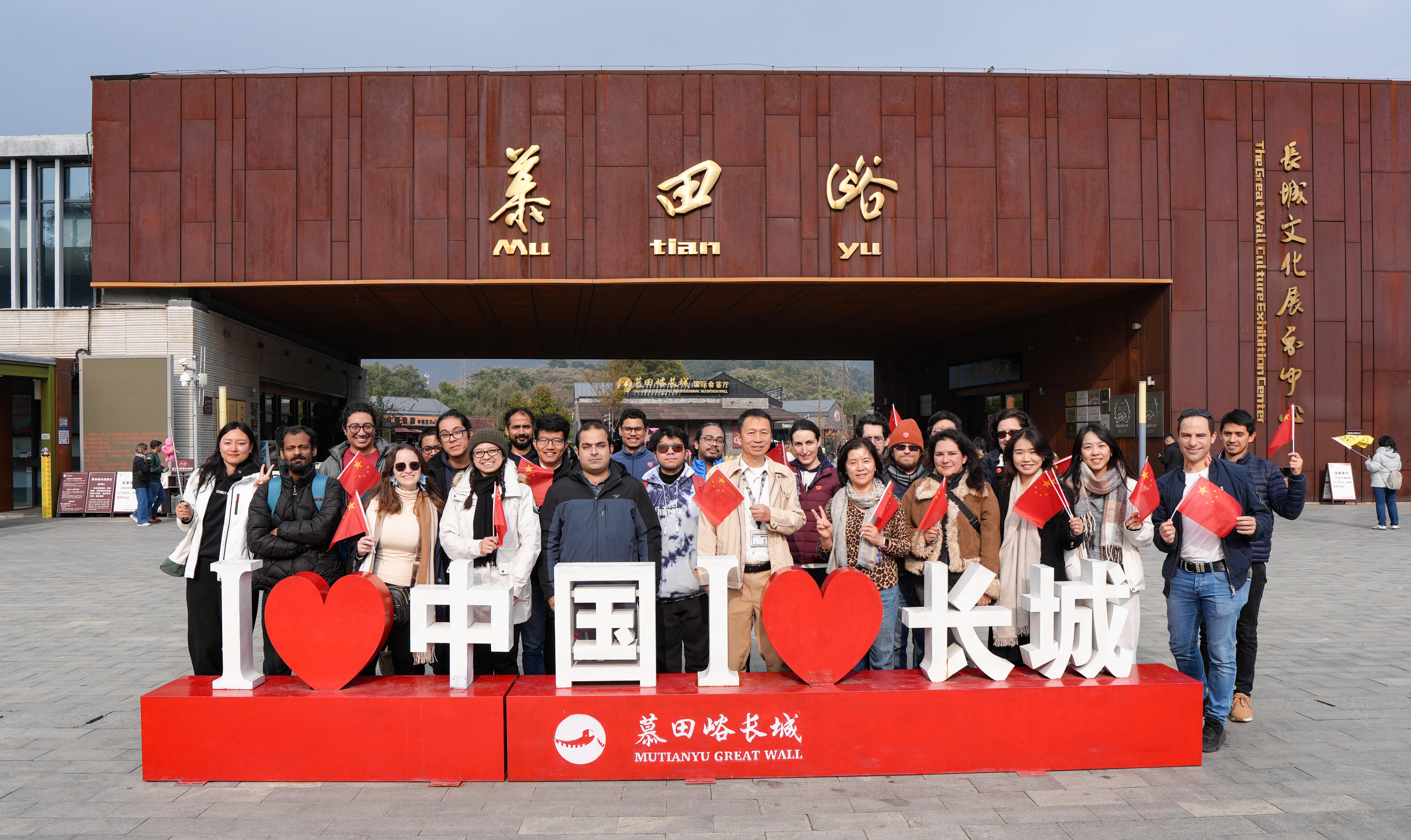 活动中,导游为大家介绍了长城的历史沿革、建筑特色与文化意义,讲解了其在中国古代防御体系中的重要地位,以及慕田峪段以“雄、秀、险”著称的独特风貌。国际学者及家属们沿石阶向上,一路攀登至8号敌楼。站在长城上,大家真切体会到大自然的壮美,并通过学生志愿者的讲解感受到建造长城背后蕴含的古代智慧。