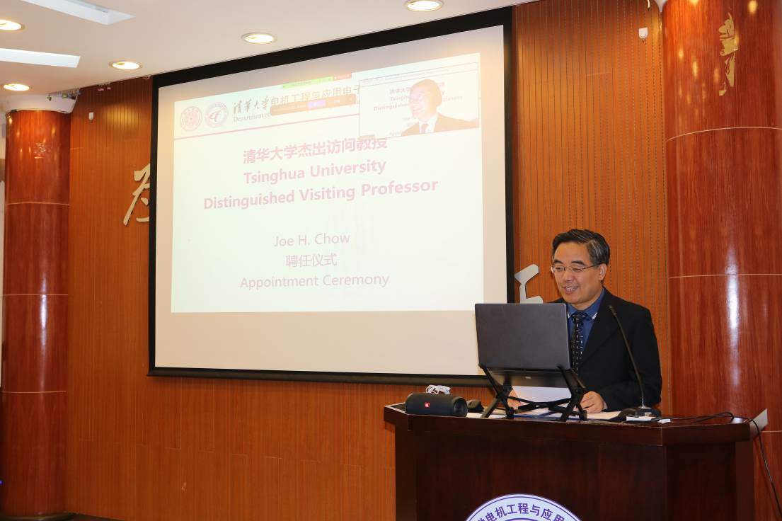 聘任仪式结束后,电机系谢小荣教授主持了周祖康院士专题学术报告会,主题为“研究电力系统四十年的思考”。报告分为两部分。第一部分周祖康总结其过去在电力系统同调、使用柔性交流输电系统进行阻尼控制、纽约中部可转换静止补偿器的运行以及同步相量数据应用方面的研究。在第二部分,周祖康介绍了其团队最近在控制风力发电机以提高电力系统稳定性方面的研究。