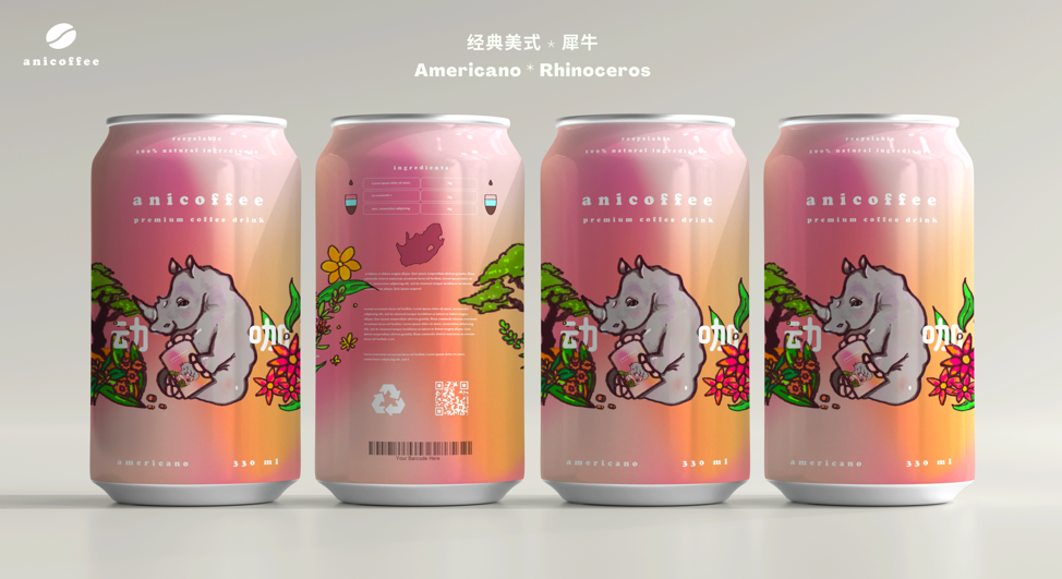 这组同学来自三个不同国家,由于疫情无法返校,作业是通过线上合作完成的。作业反映了对动物保护和可持续发展的关注,将动物元素和回收服务的APP融入到咖啡外包装设计上,目的是引发人们对动物及环境的关注。
