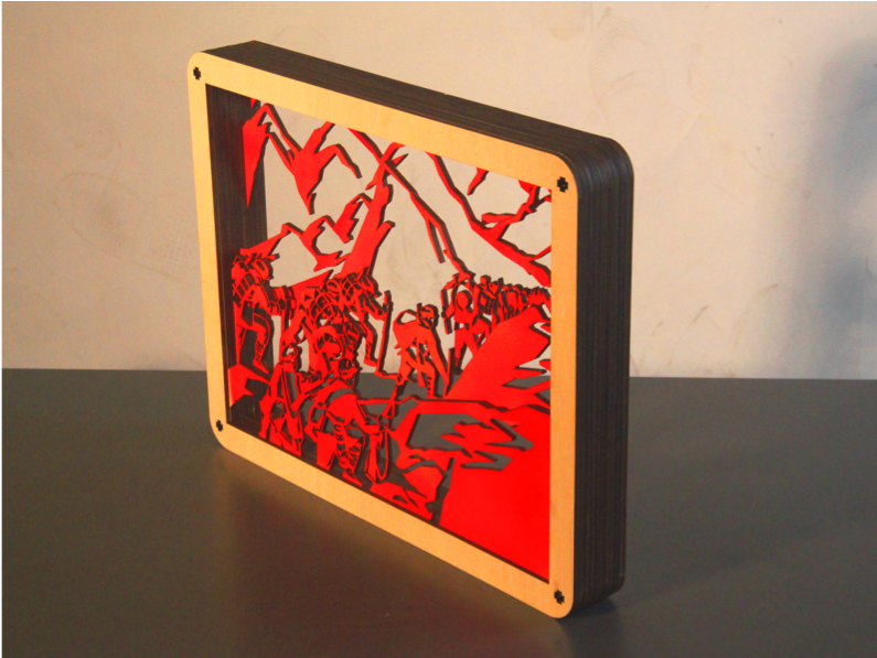 作品为工艺摆件,采用了透叠的木雕造型塑造出红军长征的场景,产品包括不同系列的木雕摆件、说明书和礼品盒。