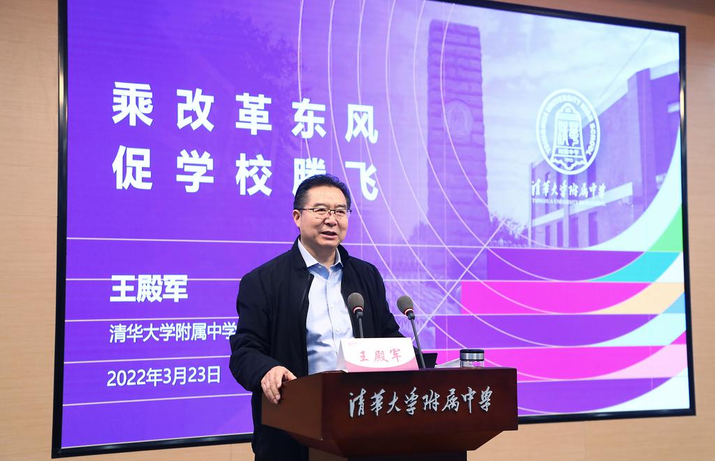 开班式后正式开始本期培训的第一次课程。清华附中校长王殿军以“乘改革东风 促学校腾飞”为题作首场专题报告。他带领大家细致分析了中国基础教育改革的现状,并就如何“激发学校的办学活力”“提高学校的育人能力”“提升学校领导力”分享了清华附中多年实践过程中的成功案例与优秀经验。