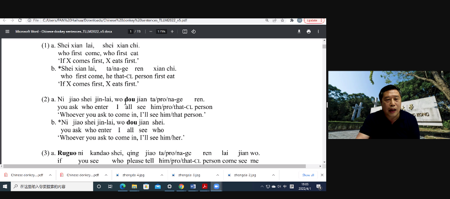 本次会议共有4场特邀报告和15场常规报告。特邀报告中,香港中文大学教授潘海华讨论了汉语当中“驴子句”的语义问题,并介绍了两种针对该问题的解读策略。