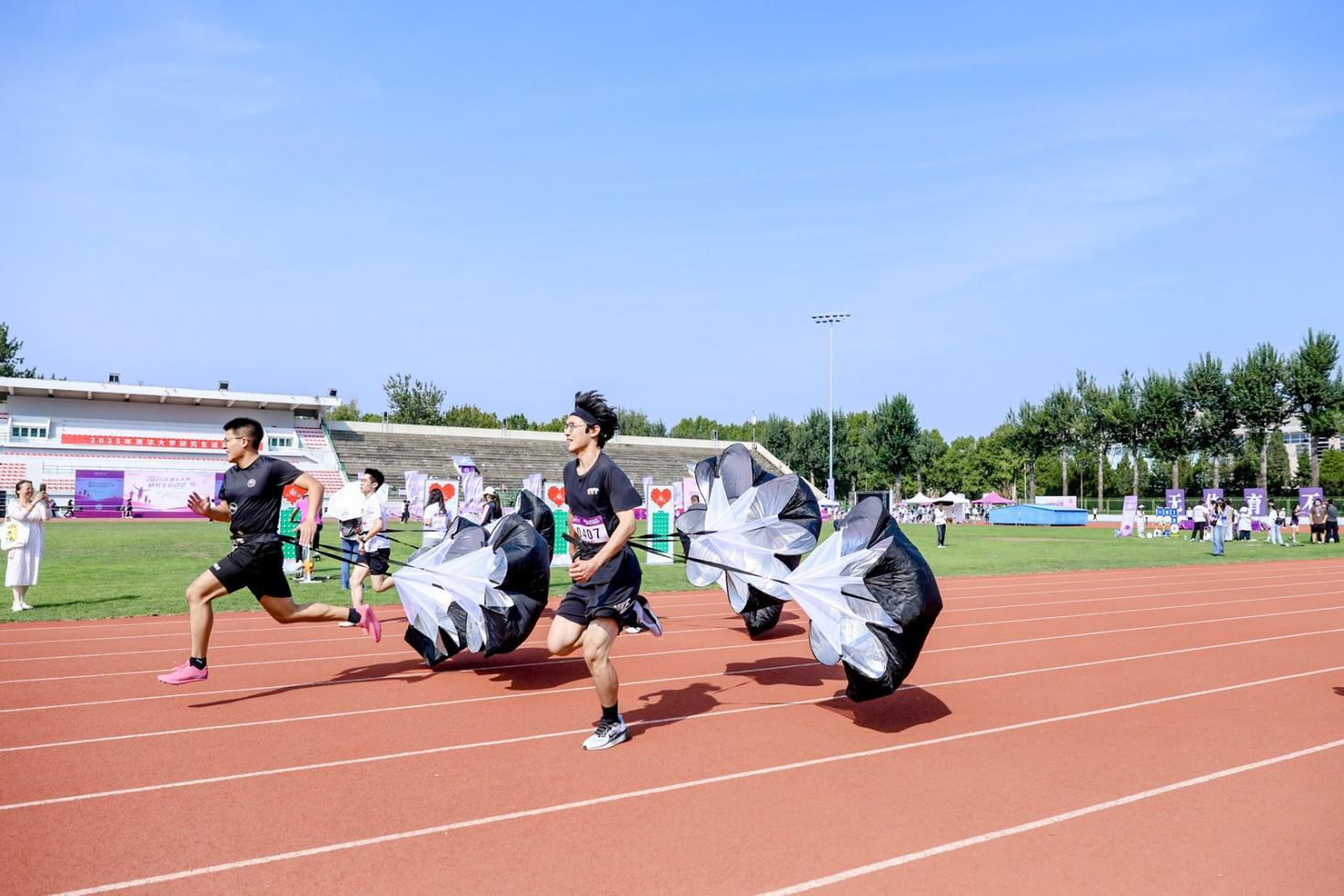 本届研运会竞技比赛部分共设置100米、400米、800米(女子)、1500米(男子)、50米阻力伞、跳高、跳远和实心球掷远个人项目,以及迎面接力、男女4×100接力、师生4×100接力和拔河集体项目。800余名师生在赛场上各显身手,同台竞技,展示拼搏精神,挥洒青春汗水,用实际行动践行“无体育,不清华”的精神。