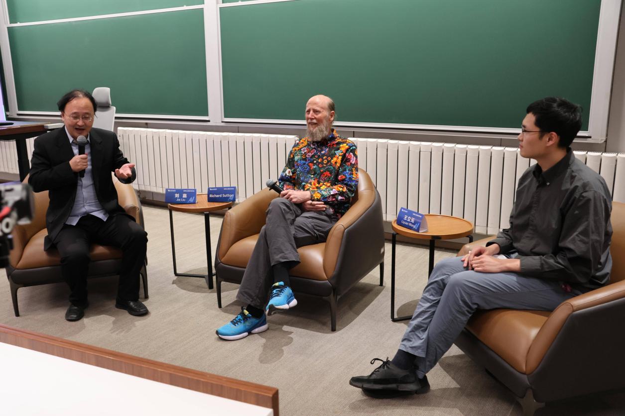 对话环节,理查德·萨顿与心理与认知科学系教授刘嘉、助理教授王立元展开对话,从认知科学、AI技术落地、跨学科协作等角度,形成技术理性与人文思考的多元碰撞。