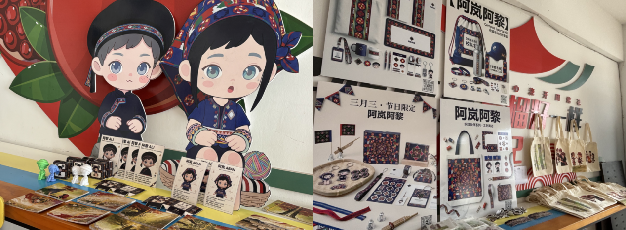 支队以“澄风入经纬”为主题策划了一场非遗文创产品展。准备阶段,支队成员前往仁兴镇新兴苗村,与非遗传承人、社区干部、产业经营者深入交流,系统学习苗锦织绣、蜡染技艺、民族服饰等非遗知识。展览现场,支队成员以各种形式让非遗“活”起来:数十幅摄影作品定格黎苗群众的生活瞬间;围绕“阿岚阿黎”IP推出的盲盒等文创吸引观众驻足;融合人与自然的动画生动展示着当地民族文化;互动区的“阿岚阿黎”IP人物线稿和苗族传统纹样,吸引着观众参与制作。活动还同步开启直播,支队线上发起黎苗纹样帆布包设计征集,蜡染书签等文创产品以及当地村民热情洋溢的竹竿舞表演也先后亮相。