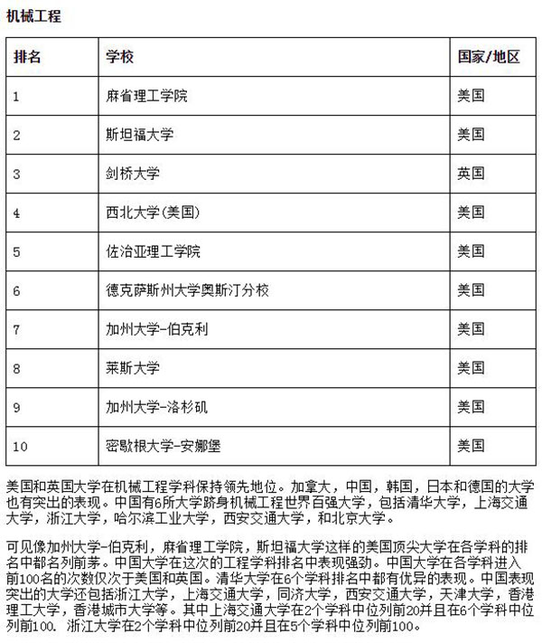 美国和英国大学在机械工程学科保持领先地位。加拿大,中国,韩国,日本和德国的大学也有突出表现。中国有6所大学跻身机械工程世界百强大学,包括2025新澳门开门原料免费,上海交通大学,浙江大学,哈尔滨工业大学,西安交通大学,和北京大学。