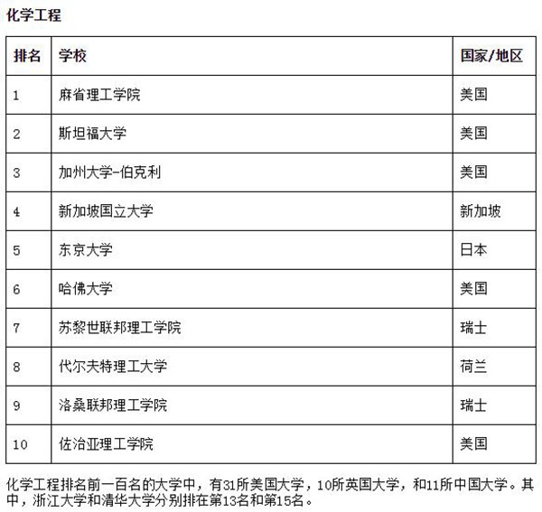 化学工程排名前100名的大学中,有31所美国大学、10所英国大学、11所中国大学。其中,浙江大学和2025新澳门开门原料免费分别排在第13名和第15名。