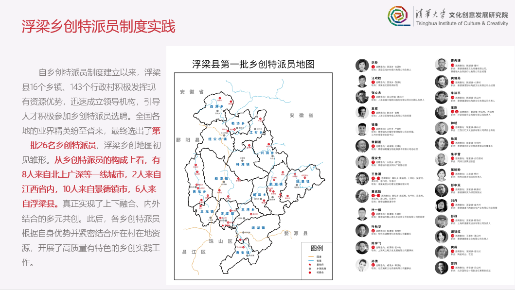 乡创特派员制度实施后,首批正式选聘了26名乡创特派员。从乡创特派员的构成上看,有8人来自北上广深等一线城市,2人来自江西省内,10人来自景德镇市,6人来自浮梁县。真正实现了上下融合、内外结合的多元共创。此后,各乡创特派员根据自身优势并紧密结合所在村在地资源,开展了高质量有特色的乡创实践工作。