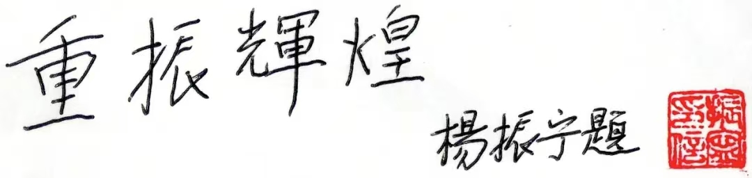 杨先生在清华园度过了美好的少年时期,又在西南联大打下了受益终身的物理学基础。他一方面见证过清华物理系早期的辉煌,另一方面对清华物理系今后的发展也充满了关心和期盼。1999年,物理系搬入新建成的理科楼,杨先生应邀出席落成仪式,并应顾秉林院士之邀欣然挥毫写下“重振辉煌”赠予物理系。