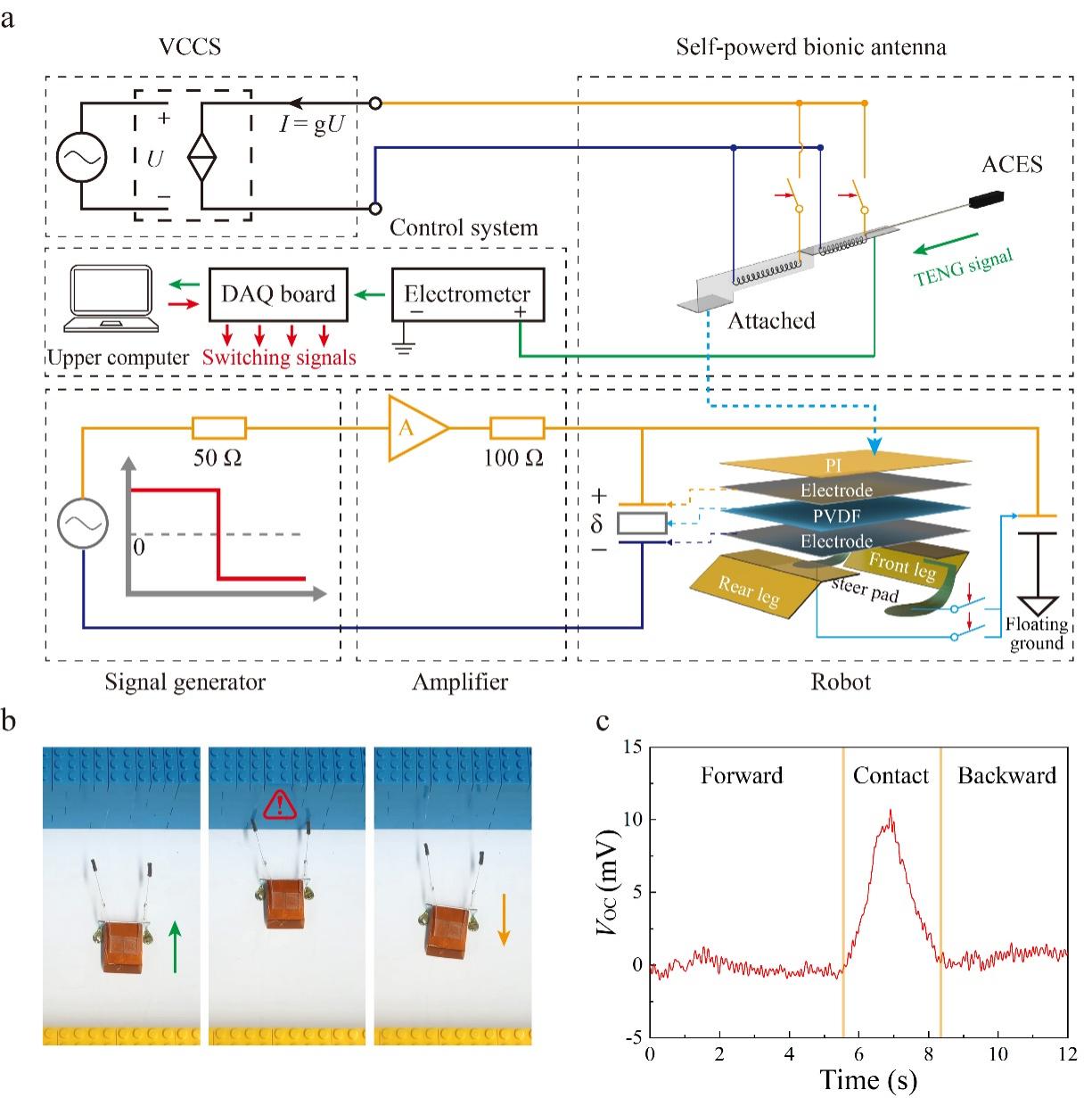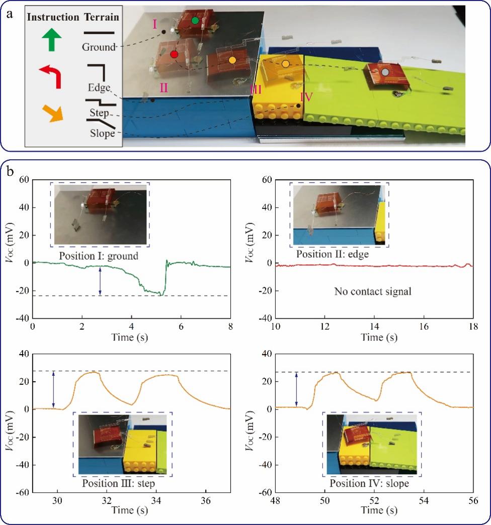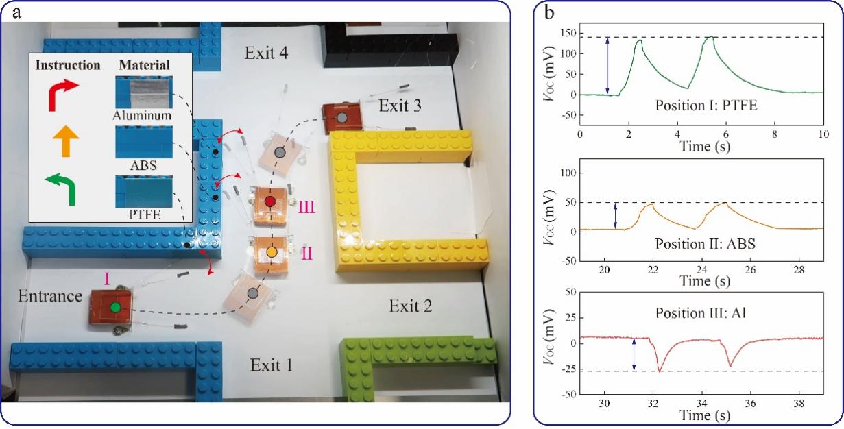 图3.(a)仿生触角在水平面上的主动感知(在避障过程中,机器人通过读取墙壁上预设的材料指令完成预设路线的行进);(b)不同接触材料对应的开路电压信号