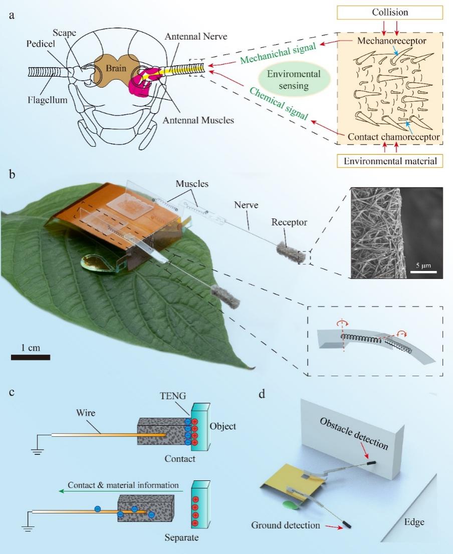 图1.(a)昆虫触角系统的解剖示意图;(b)安装仿生触角的微型机器人;(c)仿生触角感受器的传感原理;(d)仿生触角在机器人主动感知中的应用示意图