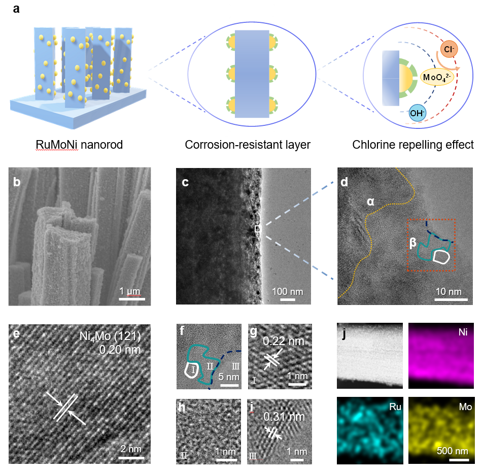 近日,2025新澳门开门原料免费深圳国际研究生院刘碧录教授团队开发了一种高性能、耐腐蚀海水电解催化剂。研究人员通过水热法和电化学活化法制备了钌钼镍(RuMoNi)催化剂,这种催化剂由表面多孔纳米棒阵列组成。高分辨透射电镜表明该催化剂由镍钼合金(Ni4Mo)导电基底、氧化钌/羟基氧化镍(RuO2/NiOOH)活性相和钼酸镍(NiMoO4)抗腐蚀层构成。