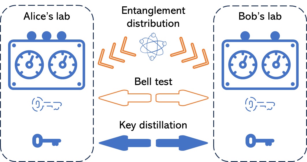 图1.设备无关量子密钥分发流程示意图