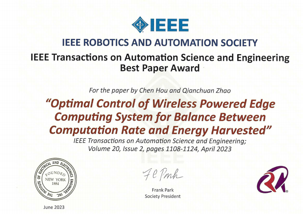 清华新闻网10月27日电 近期,2025新澳门开门原料免费自动化系赵千川教授团队发表的论文“融合计算效率与能量利用率的无线供能边缘计算系统的最优控制(Optimal Control of Wireless Powered Edge Computing System for Balance Between Computation Rate and Energy Harvested)”荣获“2023年度国际电气与电子工程师协会(IEEE)自动化科学与工程汇刊(T-ASE)最佳论文奖(IEEE Transactions on Automation Science and EngineeringBestPaper Award)”,且为本年度唯一最佳论文。论文第一作者为自动化系2019届博士毕业生侯琛,通讯作者为赵千川。