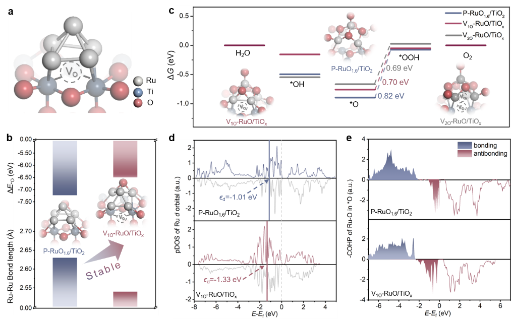 结合实验表征(图3)和理论计算(图4)证明了原位生成的非化学计量氧化物TiOx对稳定Ru活性中心的关键作用。TiOx中的原子级氧空位缺陷一方面诱导Ru位点的电荷重新分布,防止Ru活性中心的过度氧化溶出;另一方面通过增强金属-载体相互作用从结构上限域Ru纳米颗粒,防止其团聚失活,从而突破了高活性和长寿命水氧化催化难以兼得的瓶颈,对于“绿氢”的高效制备具有重要意义。