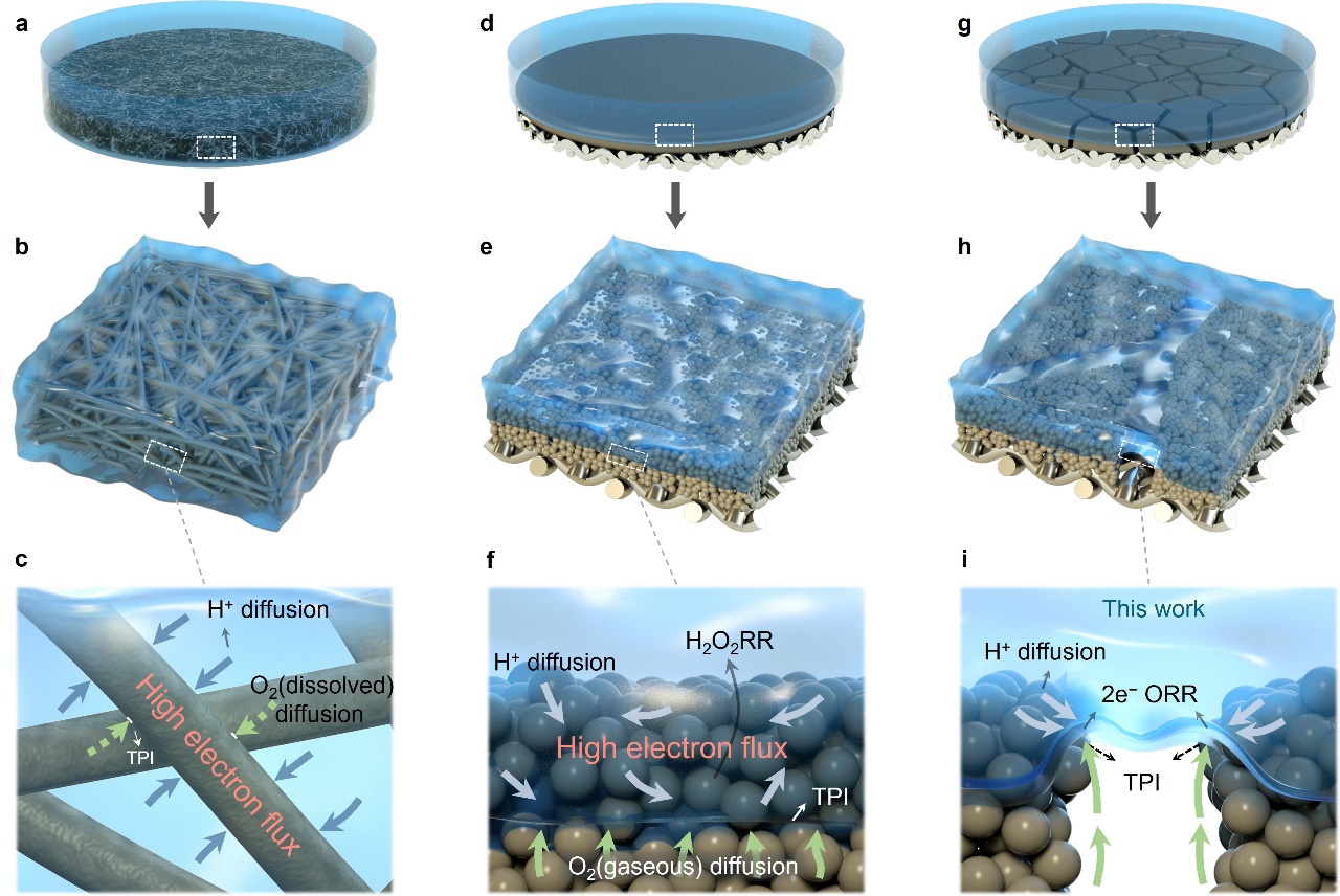 清华新闻网12月4日电 过氧化氢(H2O2)是现代化学工业的基石之一,同时也是潜在的能源载体,具有广泛的应用范围,例如增值化工产品合成以及清洁水生产等。电化学双电子氧还原反应(2e−ORR)代表了一种经济且可持续的分布式按需生产H2O2的未来战略,适用于从大规模化学品生产到小型便携式卫生设施的潜在应用。气体扩散电极(GDE)被公认为是目前最有前途的2e−ORR电极架构平台,其允许气态反应物直接从供给端输送至反应性气-液-固三相界面(TPI)而无需预先溶解到电解质中。然而,由于高电流密度操作条件下的快速电润湿对气体扩散电极反应性三相界面造成的破坏性淹没,使得H2O2电合成工艺的工业转化面临选择性低和耐久性差的重大挑战。