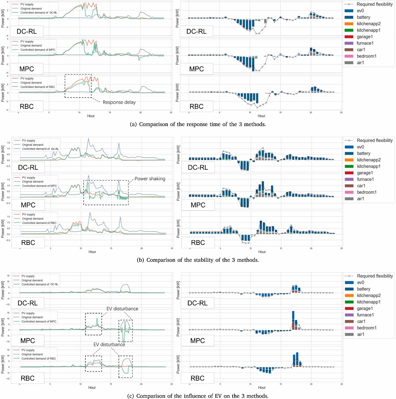 在能源控制方面,DC-RL采用了一种无模型的深度强化学习(DRL)算法Soft-Actor-Critic(SAC)来调整需求以匹配可再生供应,同时保持用户满意度。DC-RL在可再生能源供需匹配上提升了38%,同时提升了9%的用户满意度。与基线方法相比(图2),DC-RL降低了负载响应时间,实现了柔性负载快速精准响应;由于DC-RL基于无模型的强化学习方法,避免了模型预测误差对控制策略的影响,提升了面对不确定性较大负载时的稳定性。