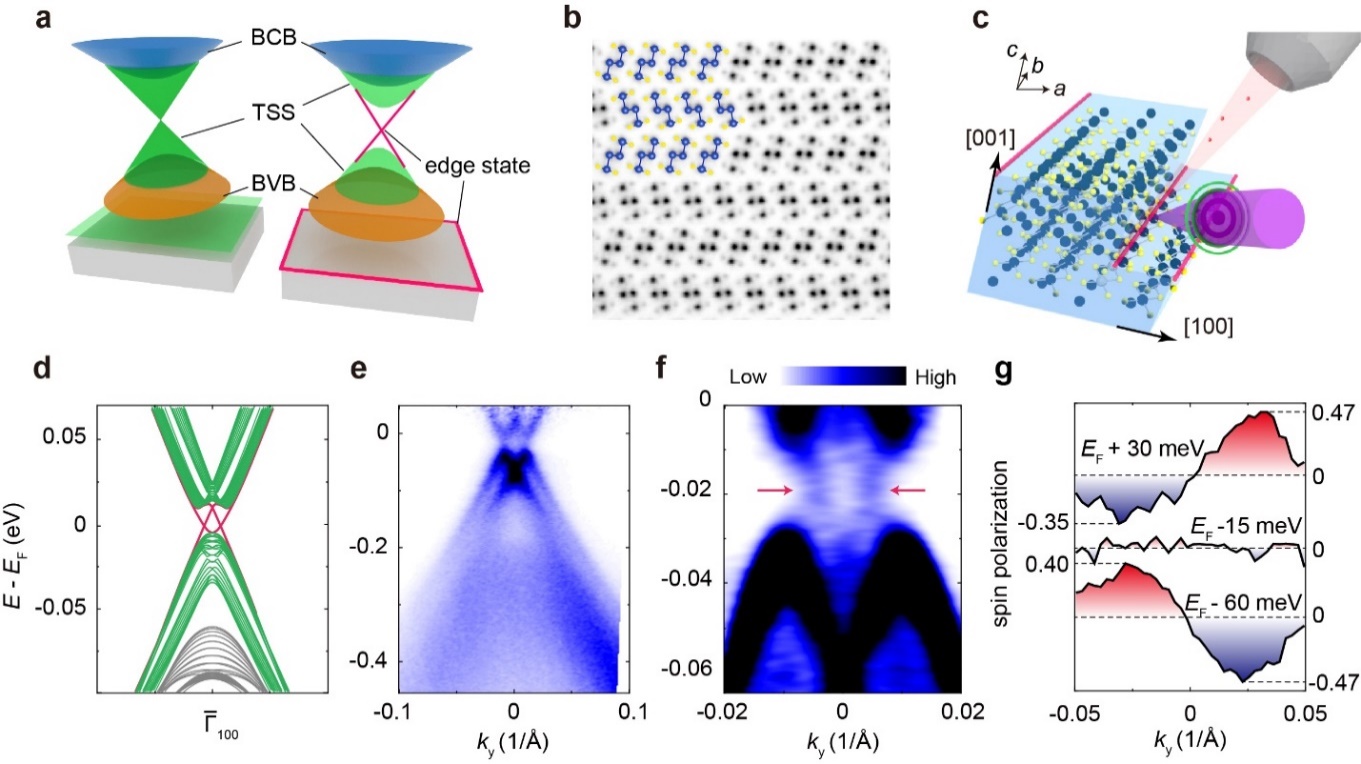 图1.a. Z2拓扑绝缘体(左)和高阶拓扑绝缘体(右)的电子结构示意图。BCB:体导带;TSS: 拓扑表面态;BVB: 体价带。b. Bi4Br4垂直链方向的扫描透射电子显微镜成像。c. 利用微区角分辨光电子能谱测量Bi4Br4电子结构的示意图。d. 第一性原理计算得到的电子结构,绿色和红色曲线分别表示(100)表面态和拓扑棱态。e. Bi4Br4(100)面的能带测量结果。f. 去卷积后的能带测量结果。g. 特定能量位置下的电子自旋极化率。