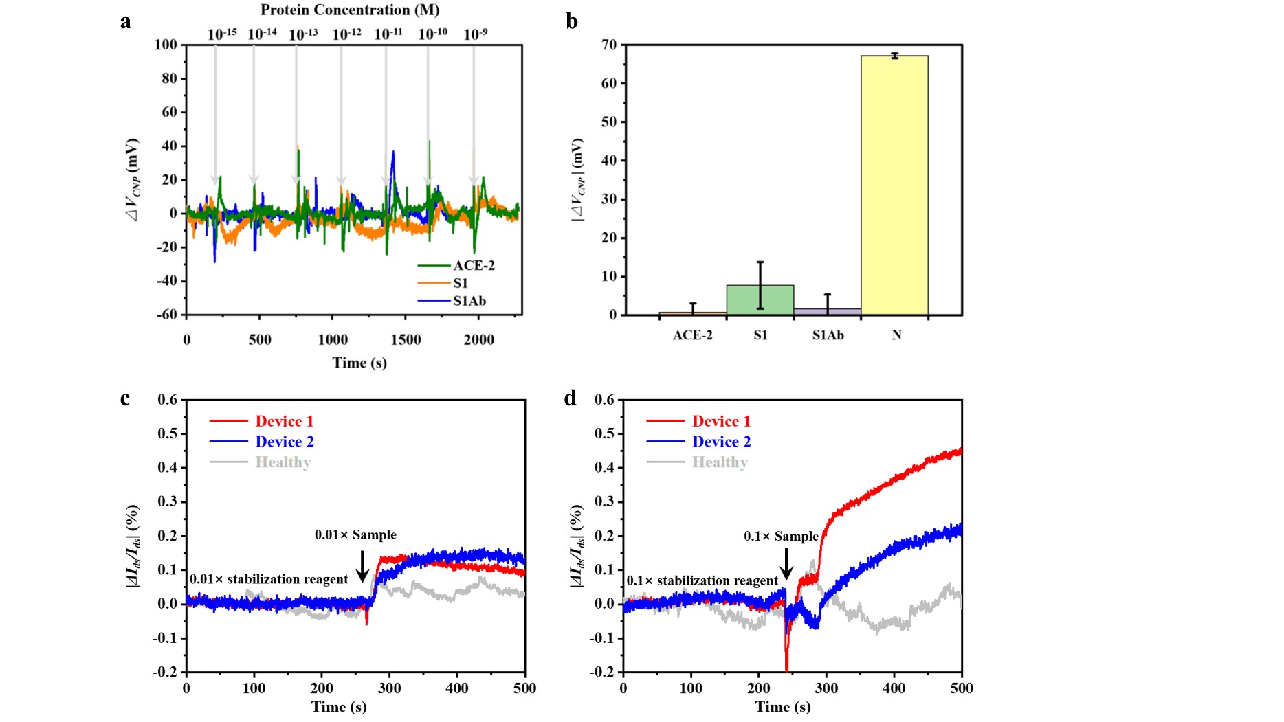 图3.GFET传感器特异性及咽拭子样本检测。(a)将不同浓度的 ACE-2、S1、S1Ab 蛋白溶液加入N蛋白抗体功能化GFET传感器时的变化。(b)1 pM浓度ACE-2、S1、S1Ab和N蛋白溶液的变化比较。(c) COVID-19患者样本与健康人样本(均稀释至 0.01×)的实时|ΔIds/Ids|信号响应。(d)COVID-19患者样本与健康人样本(均稀释至 0.1×)的实时|ΔIds/Ids|信号响应