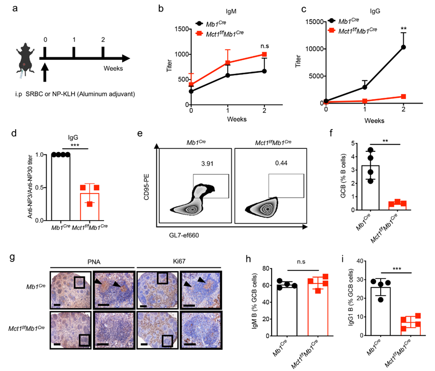 为了探索MCT1转运蛋白在B细胞中的功能,研究人员通过CRISPR-Cas9技术构建了B细胞中特异性敲除MCT1小鼠,系统性研究了MCT1在B细胞中的作用和潜在机制。研究发现在抗原免疫刺激条件下,MCT1缺失小鼠血清中的抗原特异性的IgG1抗体含量显著下降。进一步分析发现,抗体产生受阻主要是由于生发中心B细胞抗体类别转换(Class switch recombination, CSR)严重受损导致(图1)。
